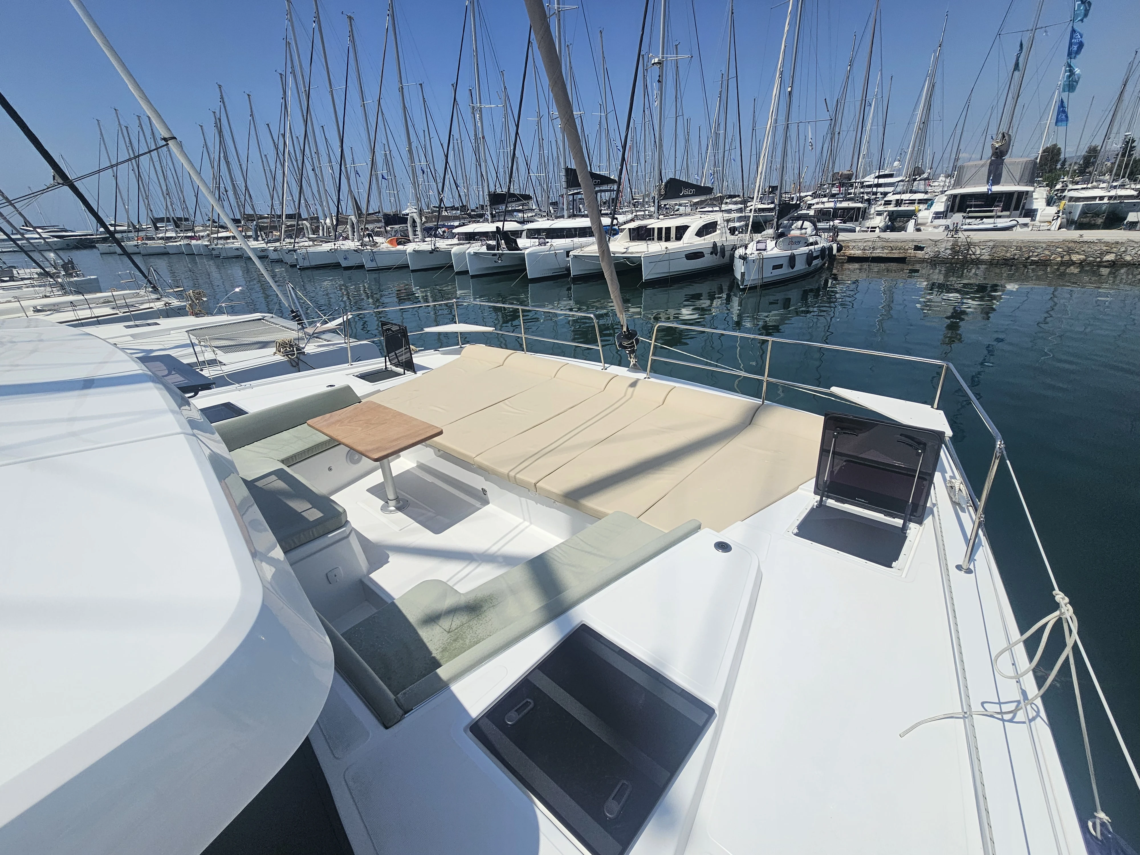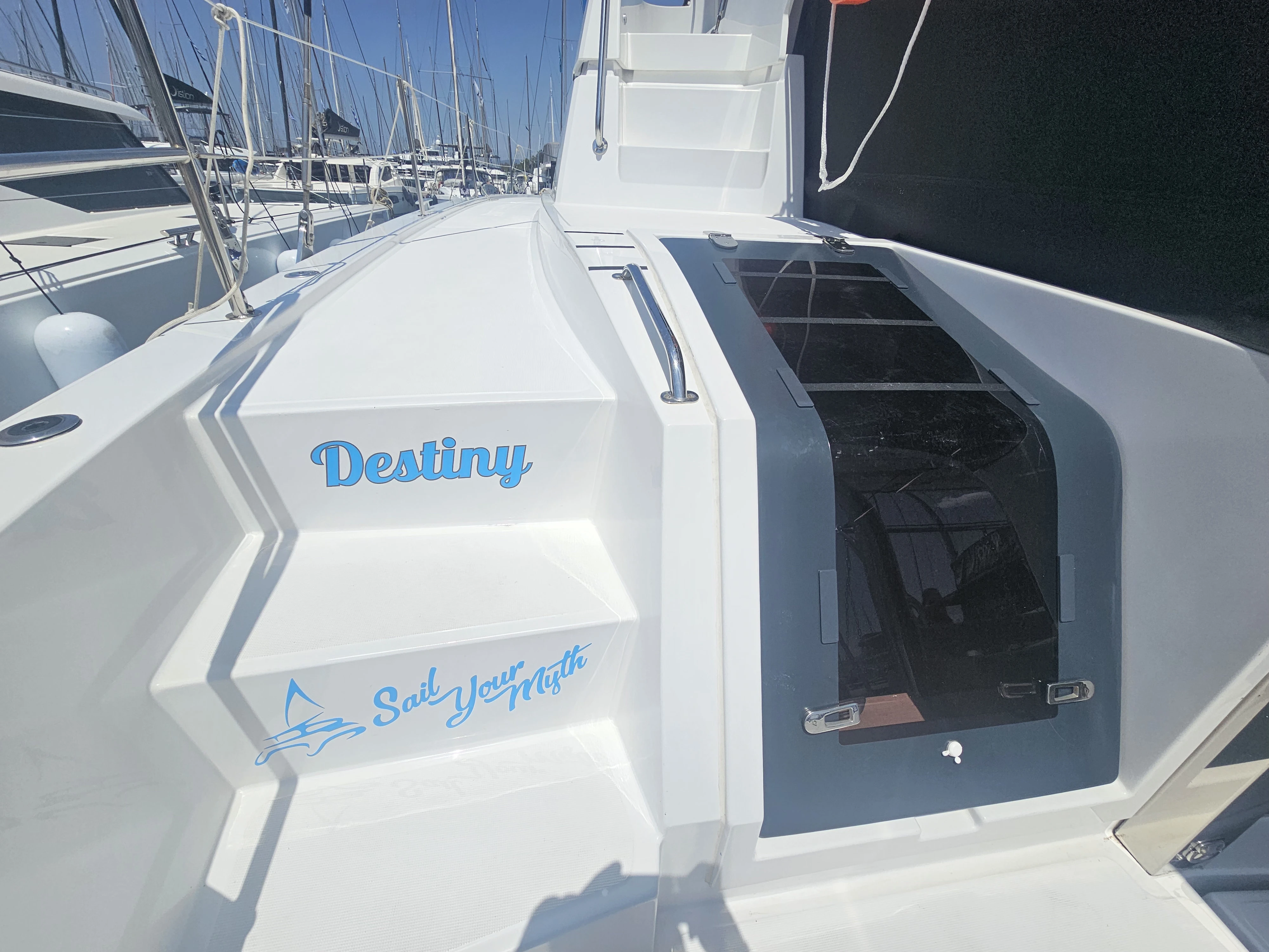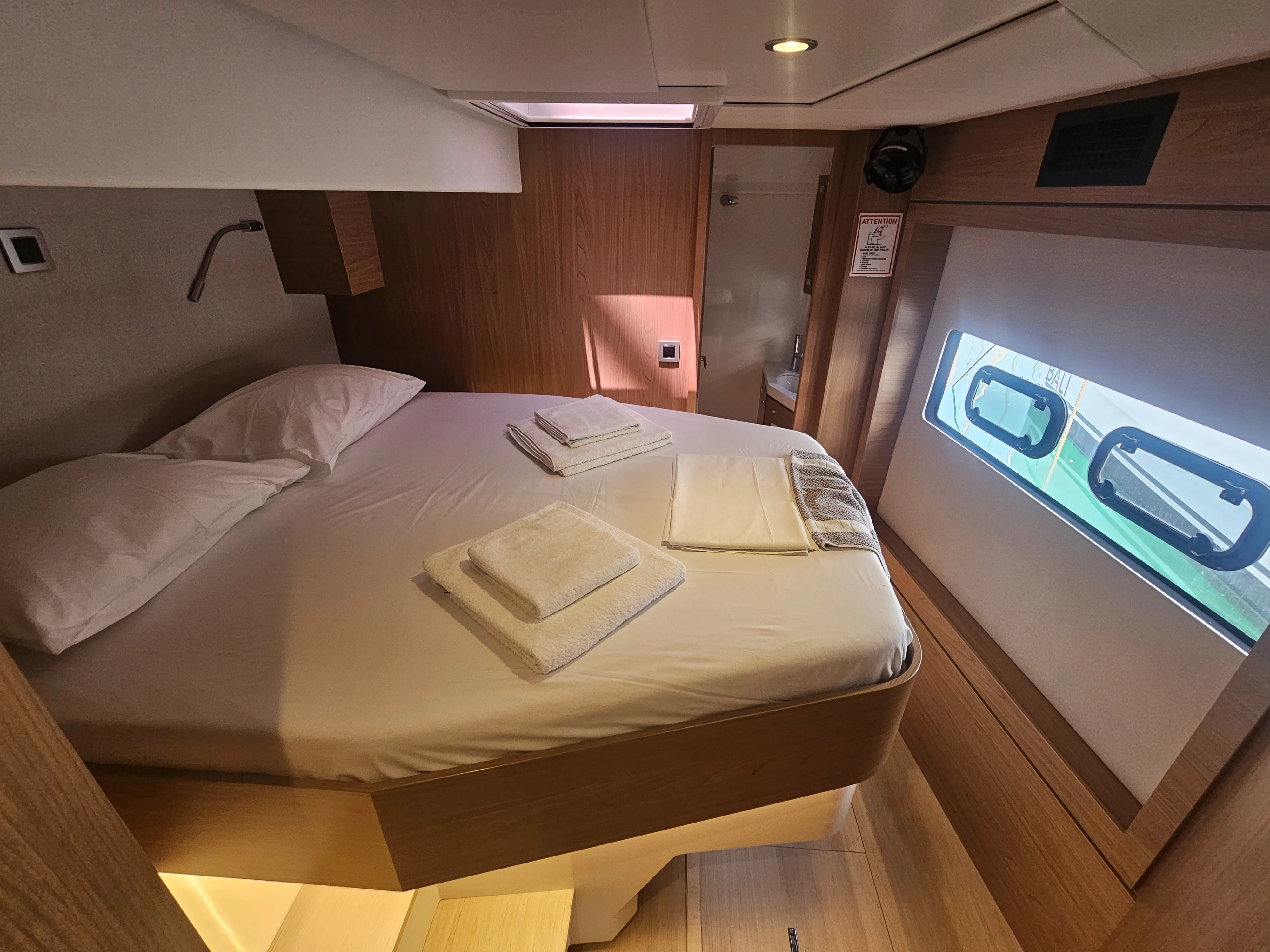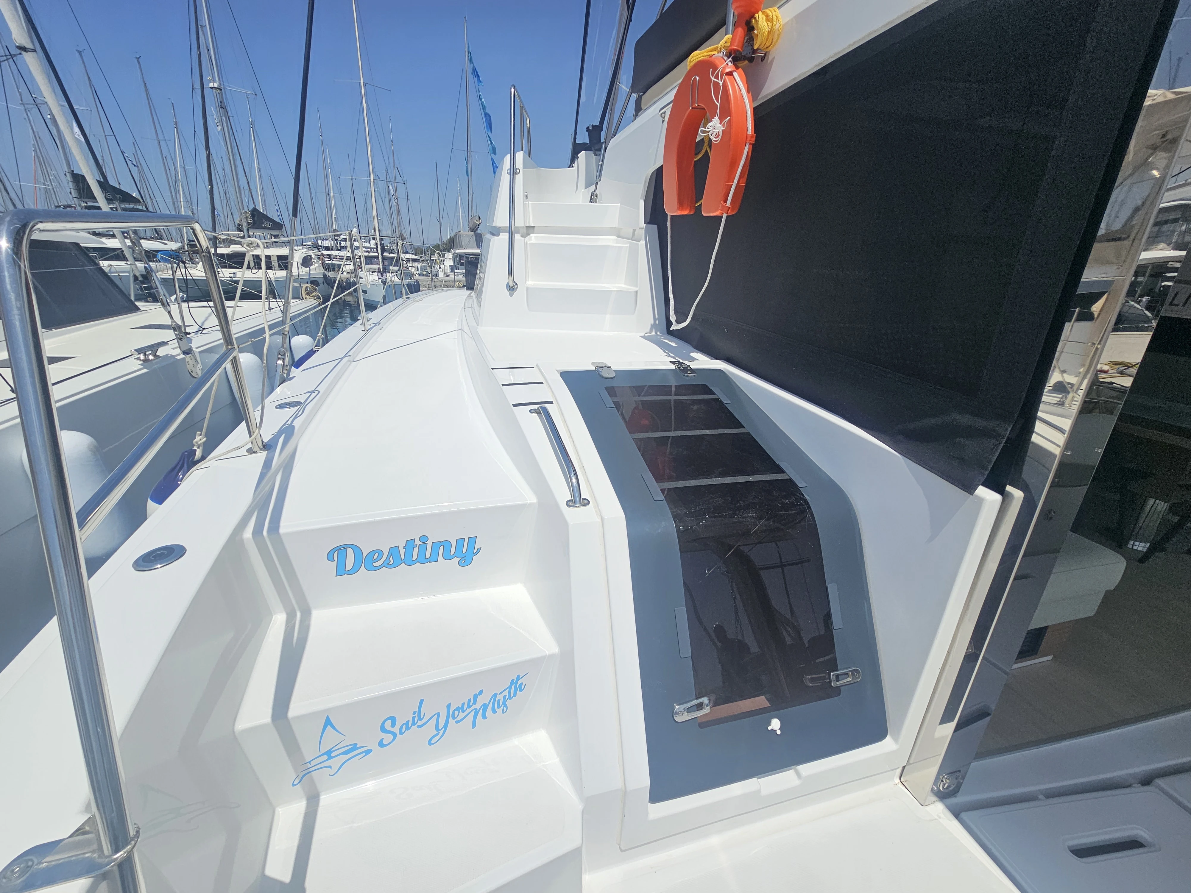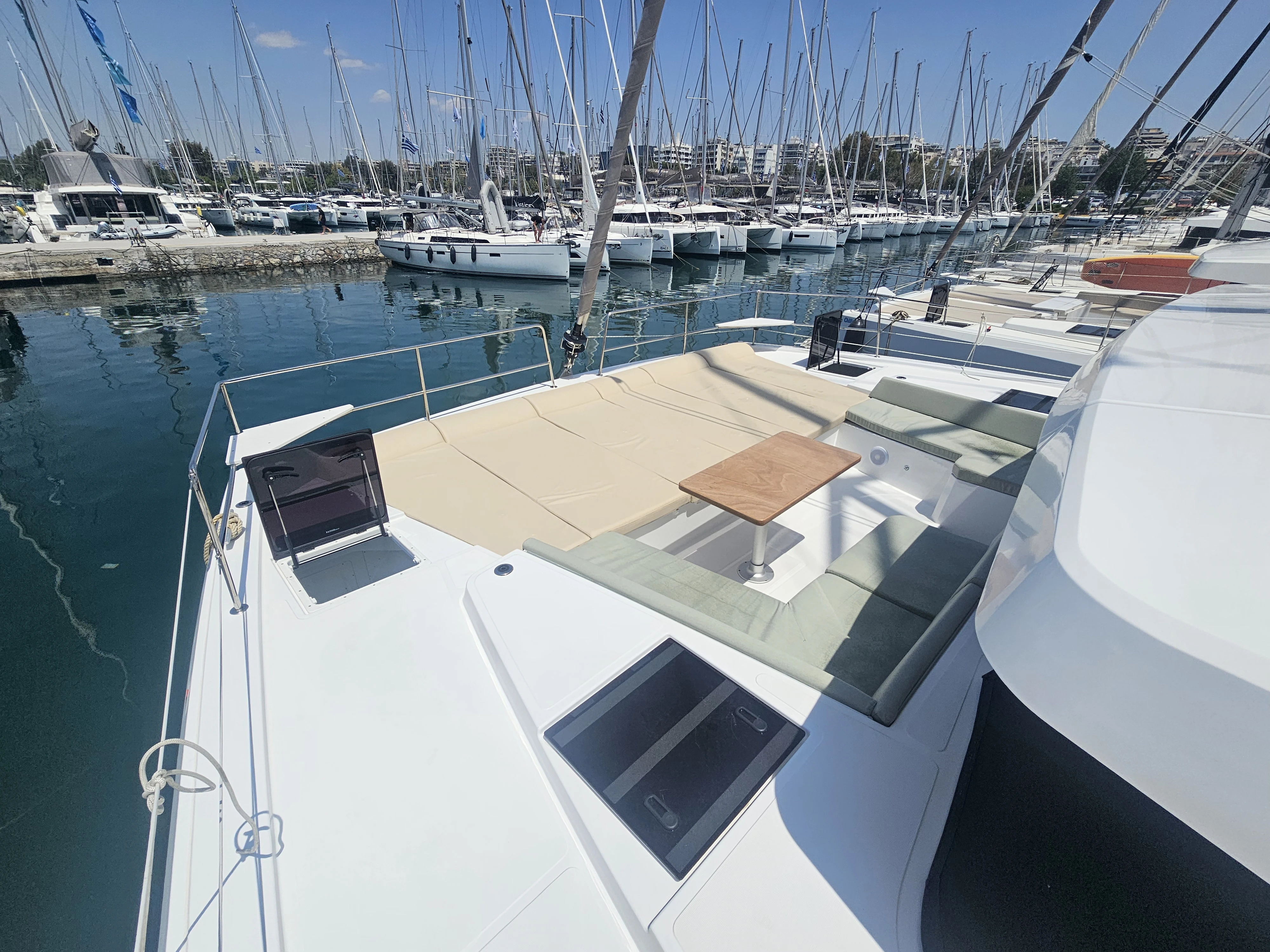 The BALI 4.8 embodies the art of French living. This 48-footer features all the assets of the BALI CATAMARANS range: her slender, straight bows creating elegant lines, her numerous storage spaces, her contemporary design, and of course, the “BALI door”. Whether under way or at anchor, you can go from the saloon to the forward cockpit in the blink of an eye through the watertight door. Whether revictualling or going ashore, a simple and practical davit system makes it very easy access the tender.