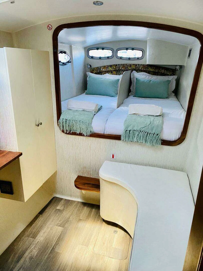 Accommodating up to 10 guests in 4 double cabins, 2 forward skipper cabins, and an extra convertible double bed in the saloon, the DH550 offers generous space for everyone on board. She features two helm stations for easy navigation and was upgraded in 2025 with an additional outside helm station, where up to five people can enjoy the stunning views while sailing.